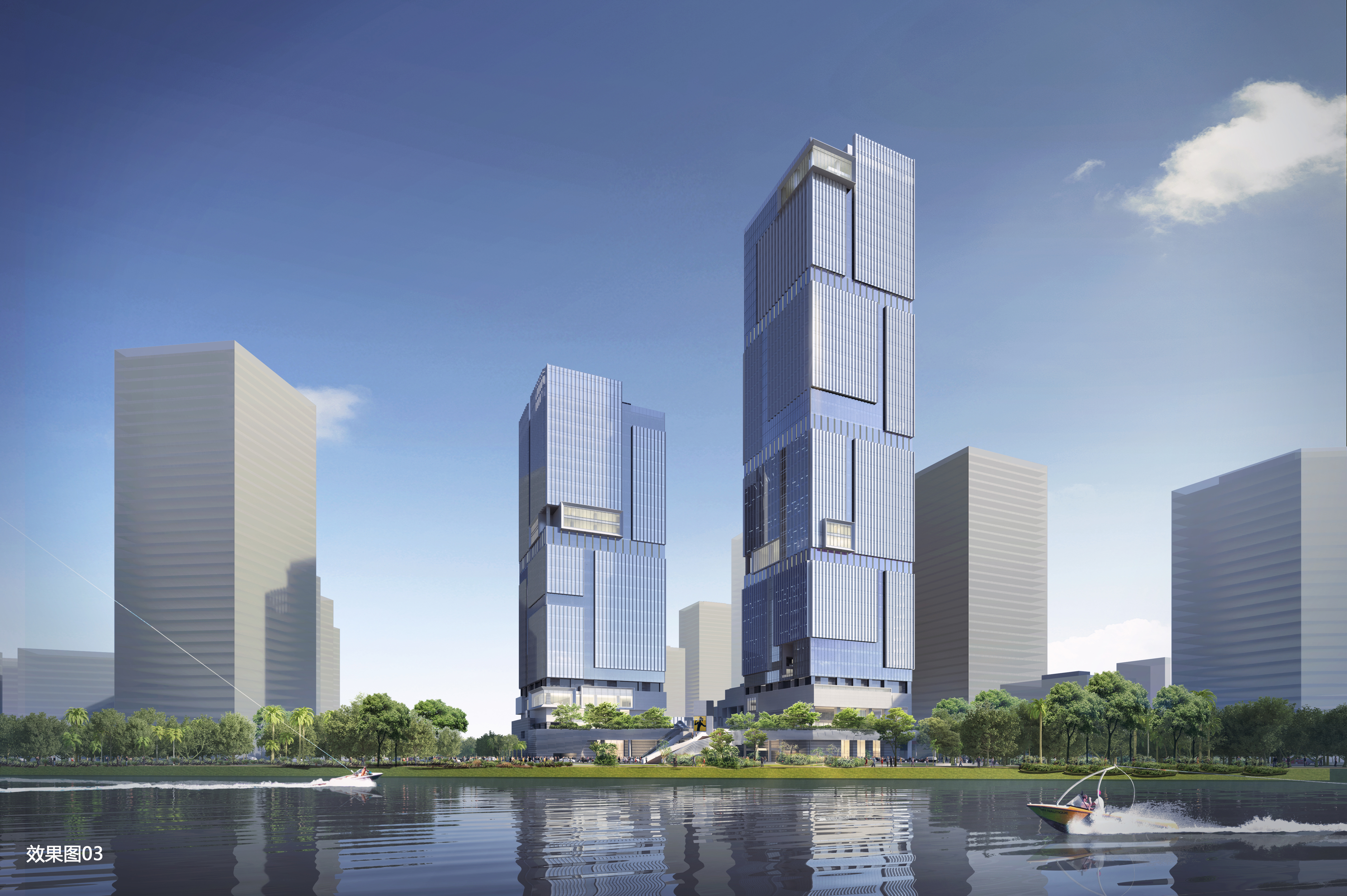 The project is located in Nansha District, China. There are two high-rise office buildings, both of which are super high-rise buildings. The total land area is 16,546 ㎡, and the total building area is 231,852 ㎡. With 29 to 47 floors, the main functions are business office and scenario-based commerce.